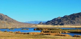 自东北向西南流淌,原始落村与大草原和谐自然的融为一体。那一栋栋的小木屋和成群结队的牧群,与雪峰、森林、草地、蓝天白云构成了独特的自然与文化景观。